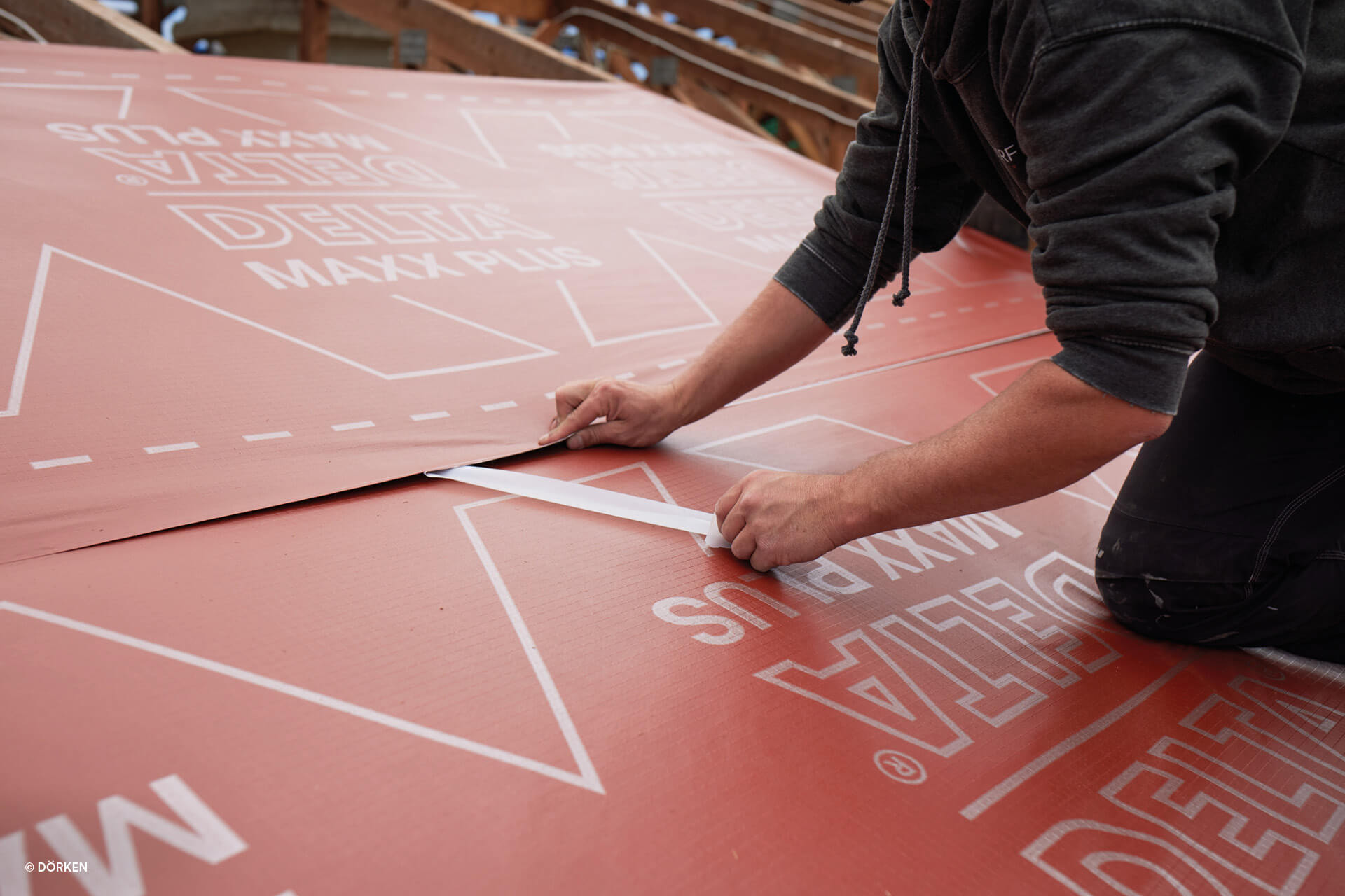 Dank der patentierten doppelten Selbstkleberänder lässt sich DELTA®-MAXX PLUS einfach drehen, wodurch die Verlegung schneller und einfacher wird. Wenige Handgriffe und kurze Wege auf dem Dach sorgen für extreme Zeit- und Kostenersparnis. Zudem entsteht im Bereich von Kehlen und Graten weniger Verschnitt. Je nach Dachgröße, Dachneigung und Dachform beträgt die Materialersparnis im Vergleich zu Bahnen mit Standardverklebungen bis zu 30 Prozent. Aufgrund der Elastizität und extremen Reißfestigkeit lässt sich das Material besonders anwenderfreundlich verarbeiten und bietet außerdem eine hohe Verlegesicherheit. Durch die besondere Kombination aus hoher Reißfestigkeit und großer Dehnung hat DELTA®-MAXX PLUS auch die verschärfte Prüfung (GS –Bau-18) für Durchsturzsicherheit überzeugend bestanden und bietet deutlich mehr Sicherheit auf dem Dach. Das dehnfähige und flexible Material von DELTA®-MAXX PLUS verzeiht zudem kleine Fehltritte beim Hochleitern auf der Traglattung. Darüber hinaus bietet das Produkt eine hohe Brandsicherheit: Dank Euro-Brandklasse B-s1, d2 (EN 13501-1) erschwert DELTA®-MAXX PLUS die Ausbreitung von Flammen. Dadurch werden sowohl Haus als auch Bewohner zuverlässig geschützt.