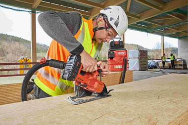 Die Akku-Handkreissäge „HS004G“ von Makita ermöglicht eine Schnitttiefe von 62,5 mm bei einem Sägeblattdurchmesser von 190 mm. Dabei wird die Handkreissäge mit einem Akku aus dem neuen „XGT“-Akkusystem von Makita angetrieben. Der Akku liefert eine Spannung von bis zu 40 V. Der bürstenlose Motor der Akku-Handkreissäge erzielt eine Leerlaufdrehzahl von 6000 min-1. Die hohe Drehzahl und das speziell entwickelte „Efficut“-Sägeblatt ermöglichen auch bei Vollholz laut Hersteller eine hohe Schnittgeschwindigkeit bei ausrissfreiem Schnittbild. Mit 62,5 mm Schnitttiefe (60,5 mm mit Schiene) können Konstruktionsvollholz, Unterdeckplatten und Dämmstoffplatten aus Holzfasern in 60 mm Dicke mit der Akku-Handkreissäge geschnitten werden. Die Handkreissäge lässt sich ohne Adapter auf Führungsschienen von Makita und anderen Herstellern einsetzen. Die durch die Kühlungsluft freigeblasene Sicht auf den Anriss und eine leuchtstarke Doppel-LED erleichtern die Schnittführung. Feste Einrastmöglichkeiten der Akku-Handkreissäge bei 22,5° und 45° erhöhen die Präzision bei Winkelschnitten. Der maximale Gehrungswinkel beträgt 48° bei einer Schnitttiefe von 42 mm.