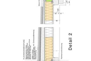 Der Unterzug aus Stahlbeton konnte auf Grund der geringen Eigenlasten der Tragkonstruktion und des Flachdachaufbaus mit 24 x 24 cm schlank gehalten werden. Die seitlichen Auskragungen konnten durch thermisch getrennte Verlängerungen des Ringankers auf dem Mauerwerk an der Traufe beziehungsweise des Unterzuges über die Fensteröffnungen aufgenommen werden.