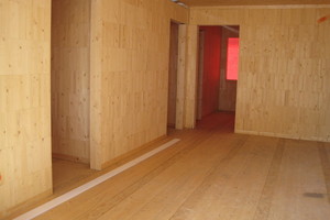 Auch der Fußboden in den Wohnungen ist in Trockenbauweise erstellt. Auf trittfesten Holzweichfaserplatten liegen Schalldämmplatten (Hersteller Schallfresser) mit Quarzsandfüllung und doppellagig Gipsfaserplatten von Fermacell. Der abschließende Bodenbelag ist Linoleum.