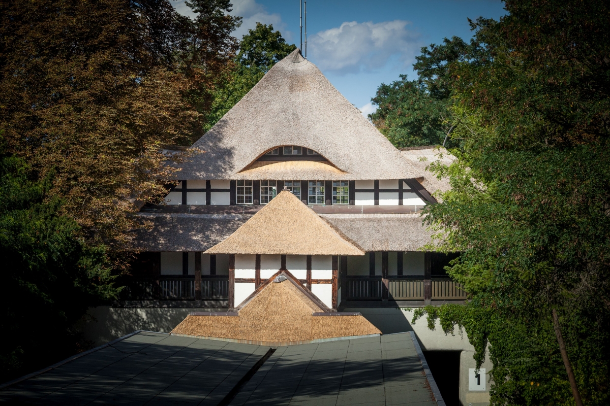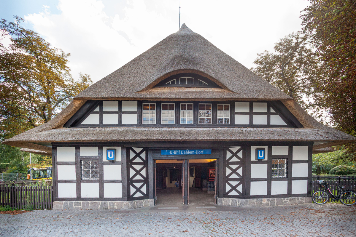 Der Berliner U-Bahnhof Dahlem-Dorf wurde mit Reet eingedeckt. Das Dach des Fachwerkgebäudes ist als Krüppelwalmdach gestaltet