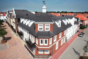 Bei dem Wohnquartier wird das Dach zum wesentlichen Gestaltungselement. Unterschiedliche Formen von Walm- und Mansarddächern beleben die Häuserlandschaft. Flachdachgauben und geschmackvolle Türme mit Dachreitern setzen zusätzliche Akzente. Verwendet wurden knapp 2000 Quadratmeter granitfarbene Sigma-Pfannen des Herstellers Nelskamp. Dachdeckermeister Ralf Weßling aus Isselburg freut sich über das Ergebnis: „Die Pfannen fügen sich wunderbar in das Gesamtbild ein.“