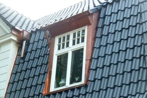 Um die anspruchsvolle Architektur konsequent einzuhalten, kamen für alle anderen Baustoffe ebenfalls nur hochwertige und langlebige Materialien zur Anwendung. So wurden alle Metallarbeiten (Kehlen, Dachrinnen / Fallrohre, Dachgauben- / Kaminkopfbekleidungen usw.) vom Meisterbetrieb Wrage ausschließlich in Kupfer ausgeführt.