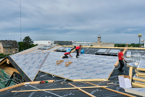 Als Notabdichtung und Konvektionssperre verlegten die Handwerker auf den Dachflächen zunächst die mechanisch stark belastbare Bahn „Top DSB 100“ von Puren. Zur luftdichten Fügung der sich überlappenden Bahnen sind diese im Nahtbereich mit einem „Kleber-auf-Kleber-System“ ausgestattet. Das sorgt nicht nur für die luftdichte Verbindung der Bahnen untereinander, sondern verhindert auch Feuchtewanderung durch Kapillare, also kleine Hohlräume. Die blendfreien Bahnen mit einem sd-Wert von ≥ 100 m boten während der gesamten Dacharbeiten Witterungsschutz für die darunterliegende Konstruktion. Da sich die Dacharbeiten über mehrere Wochen hinzogen, sicherten die Zimmerleute die Konvektionssperrbahnen zusätzlich mit Dachlatten.