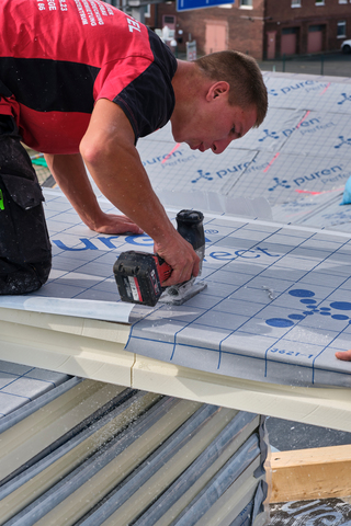 Beim Neubau in Köln kamen zur Dämmung der fast 2500 m² umfassenden Dachflächen PU-Dämmplatten von Puren zum Einsatz. Ausgeführt wurden die Dacharbeiten vom 1848 gegründeten Fachbetrieb Holzapfel Holzsystemtechnik GmbH aus dem nordhessischen Eschwege.