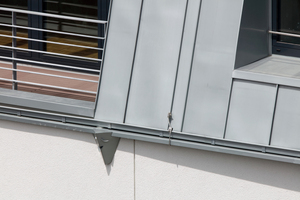 Ähnliche Sorgfalt in Planung und Ausführung waltete bei der Entwässerung über den Fenstern und auf den teilweise sehr tief eingeschnittenen Fensterbänken, sodass unschöne Fließspuren des Wassers nicht zu befürchten sind. Die technisch langlebige Titanzinkdeckung wird auch optisch für lange Zeit allen Ansprüchen gerecht werden und im Laufe der Zeit ein individuelle Patina ausprägen.