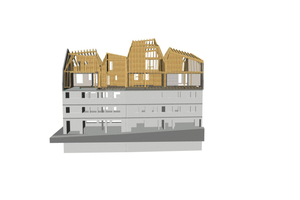Außerdem war eine gleichmäßige Lastverteilung erforderlich. Deshalb begannen die Arbeiten unter Bauleitung von Michael Müller-Offermann (Bergisch Gladbach) nach dem Abriss des alten Daches mit dem Aufbau eines 50 cm hohen Stahlträgerrostes oberhalb der letzen Geschossdecke. Darauf entstanden in einer kombinierten Bauweise aus vorgefertigten Wänden in Holztafelbauweise und zimmermannsmäßig errichtetem Dachstuhl die beiden neuen Geschosse. Die strengen Brandschutzforderungen konnten eingehalten werden, indem die Wohnungstrennwände mit Gipsfaserplatten bis zur Qualität F90 beplankt und die tragenden Holzbauteile teilweise über das statisch Erforderliche hinaus mit einer Brandreserve dimensioniert wurden.