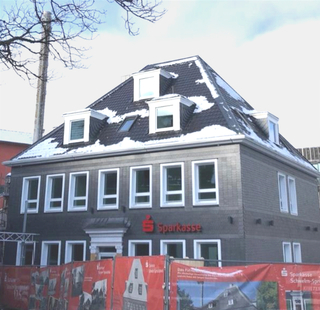 Das alte, regionaltypisch schieferverkleidete Wohn- und Geschäftshaus am Bürgerplatz in Schwelm, der Kreisstadt des Ennepe-Ruhr-Kreises nordöstlich von Wuppertal, wird im Volksmund „Patrizierhaus“ genannt. Es wurde um das Jahr 1700 errichtet und diente der benachbarten Privatbrauerei von 1830 bis 2011 als Verwaltungsgebäude. 2018 erwarb die städtische Sparkasse Schwelm das Gebäude, um dort die Firmenkundenberatung und das „Private Banking“ unterzubringen. Ein Gutachter stellte allerdings so große Mängel an der Bausubstanz fest, dass eine Sanierung des Denkmals nicht möglich war. Es blieb nur der Abriss, der das Stadtbild am Bürgerplatz zerstört hätte. So beschloss die Sparkasse, das alte „Patrizierhaus“ durch einen Neubau in ähnlicher Form zu ersetzen und so den vertrauten Anblick wiederherzustellen. Auch beim Walmdach orientierte man sich, von den Gauben abgesehen, in Absprache mit der Denkmalpflege am alten Dachbild. First, Grate und Gauben des Daches wurden mit Schiefer eingedeckt, die Dachflächen mit ähnlichen Tondachziegeln wie beim Bestandsgebäude.