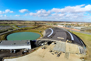 Die Ausführung von Fassade und Dach des Hangars enthielt einige Herausforderungen, da die Form zwei verschiedene Krümmungen in sich vereint. Zum einen die Krümmung des Gebäudes um die eigene Längsachse und den See, zum anderen aber die gewölbte Form von Dach und Fassade selbst. Denn das Gebäude besitzt einen fast eiförmigen Querschnitt. Erforderlich war also ein Material, dass sich entsprechend flexibel verarbeiten ließ und gleichzeitig für die Wand- und Dachbereiche eingesetzt werden konnte. Die Architekten entschieden sich für „Anthra-Zinc“, ein anthrazitfarbenes Titanzink vom Hersteller VMZinc. Verarbeitet in der Stehfalztechnik lässt es sich so flexibel handhaben, dass sich die gebogenen Formen, die die Architekten vorgesehen hatten, detailgenau umsetzen ließen.