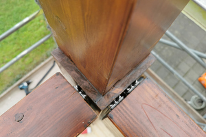Werden Holzträger von Balkonen oder anderen Holzkonstruktionen im Außenbereich stumpf und ohne Fuge mit Holzstützen verbunden, besteht die Gefahr, dass eingedrungene Feuchtigkeit im Hirnholz nicht schnell genug abtrocknen kann. Bei bewitterten Anwendungen resultiert daraus häufig Korrosion an den Verbindungsmitteln, da die Nässe im Hirnholz stehen bleibt. „So geschädigte Balkone erneuern wir daher entsprechend den heutigen Vorgaben grundsätzlich mit Edelstahlverbindern und Fuge, sodass der Verbinder und der Anschluss luftumspült sind“, sagt Zimmermeister Frank Matthies aus Dresden.