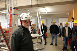 Der Schulungstag ist lang für die Gruppe, bisweilen auch langatmig. Aufmerksam werden die Handwerker immer dann, wenn sie selbst Hand anlegen und Dinge ausprobieren dürfen. Beispielsweise bei der Unterweisung mit Leitern mit Absturzgeländer. Die Unfallgefahr ist bei normalen Bockleitern ohne Geländer hoch, noch höher, bei denen, die keine Plattform besitzen. Sicherheitsleitern mit Plattform hingegen haben ein Geländer und breite Standfüße für sicheren Stand. Das Verschieben solcher Leitern ist ein wenig aufwendiger, aber sie sind sicherer.