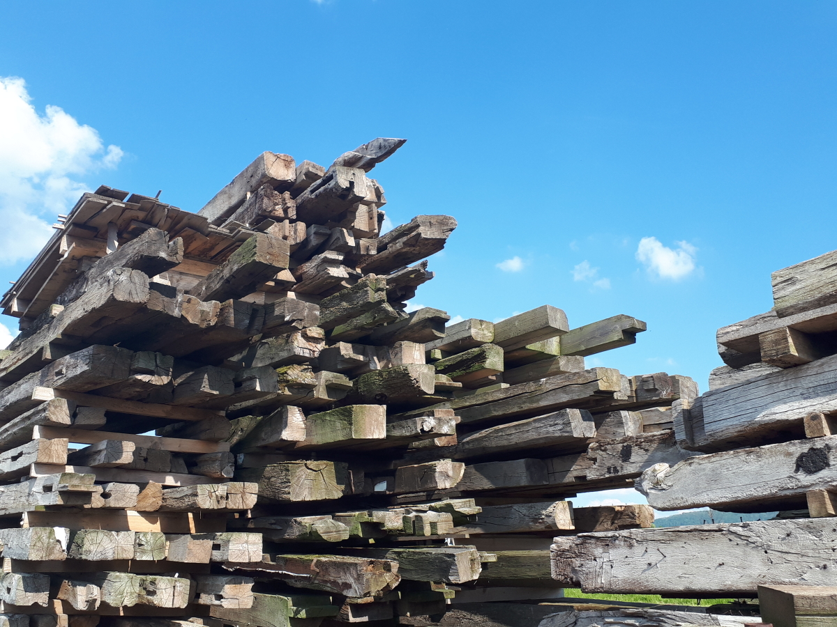 Altholzbalken im Außenlager der Firma Historische Bauelemente in Marwitz bei Berlin