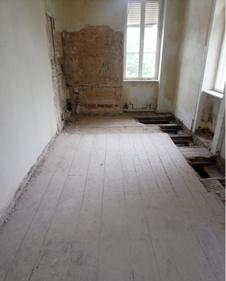 Die Arbeit beginnt mit der Demontage auf der Baustelle. Die historischen Dielenböden sind oft unter mehreren Schichten Estrich, Spanplatten, Kleberesten oder Teppichen verborgen. Diese müssen sorgfältig entfernt werden, bevor die eigentlichen Dielen freigelegt werden können. Je nach Zustand des Gebäudes und Beschaffenheit des Unterbaus kann allein dieser Vorgang mehrere Stunden dauern.
