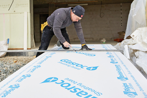Ein anderer Wandaufbau wurde für die Außenwände im Erdgeschoss und in der innenliegenden Loggia gewählt. Deren Bekleidung erfolgte in Eigenleistung, weshalb der Bauherr nach einer gleichermaßen schnellen und einfachen Lösung suchte. Diese fand er in der vliesarmierten Gipsplatte „Rigips Glasroc X“. Die feuchteresistente Platte eignet sich speziell für die Bekleidung von Außenwänden in Holzbauweise. „Die Montage auf der Unterdeckbahn und der Traglattung erfolgte in wenigen Arbeitsschritten“, so Florian Bäßler. Durch einfaches Ritzen und Brechen der Platten konnten diese auf das gewünschte Maß zugeschnitten und anschließend an der Unterkonstruktion mit einem Abstand von 75 mm verschraubt werden.