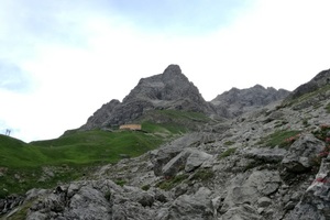 Der Abstieg zur Hütte, die im Herbst 2015 abgerissen und als Holzbau wieder neu aufgebaut wurde, geht über die Bockkarscharte. Nach steilem bergab, über ein riesiges, von der Sonne aufgeheiztes Geröllfeld, ist dann das Tagesziel auf 2084 Metern erreicht. Nur scheinbar wirkt die Modernität fremd, die goldgelb gefärbte Holzschindelfassade passt sich der wilden Natur an. Aus der ehemaligen Steinhütte ist nach dem Wiederaufbau ein moderner, Energie autarker Holzbau im hochalpinen Gelände entstanden.