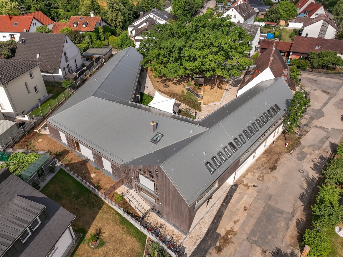Im Stadtteil Unterreichenbach ist mit dem „Kinderhaus unterm Blätterdach“ eine neue Kindertagesstätte entstanden. Der Neubau vom Architekturbüro Dotterweich-Bort ging aus einem Wettbewerb hervor und ersetzt den alten Kindergarten. Ein Teil des Bestands – ein straßenseitiger Massivbau mit Flachdach – wurde in den Entwurf integriert, aufgestockt und mit einem neuen Satteldach überdeckt. Zusammen mit den Neubaukörpern, die den Garten dreiseitig einfassen, entsteht ein klar gegliedertes Ensemble. Die zentrale Eiche markiert den vierten Abschluss und gibt der Einrichtung ihren Namen.