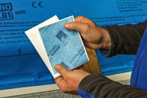 Schwierig abzuklebende Bereiche sind unvermeidlich, sowohl beim Neubau als auch bei der Sanierung. Dafür gibt es flexible und wasserfeste Klebepflaster, die Handwerker auch in enge Zwischenräume, zum Beispiel unter dem Sparren, einfügen und verkleben können.