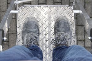 Die Aluminium-Stufenstehleiter mit Plattform ist in fünf unterschiedlichen Größen für Arbeitshöhen von bis zu 3,85 m erhältlich. Die Stufenzahl reicht dabei von vier Stufen in der kleinsten Größe bis hin zu acht Stufen in der größten Variante, jeweils inklusive der Standplattform. Die Sicherheits-Features der Leiter überzeugten auch die Berufsgenossenschaft der Bauwirtschaft (BG Bau). Sie unterstützt ihre Versicherten beim Kauf von leichten Plattformleitern wie der „ML Plattformleiter“ mit bis zu sechs Stufen inklusive Standplattform und übernimmt im Rahmen der beitragsabhängigen Förderung die Hälfte der Anschaffungskosten (maximal 250 Euro). Bei einem Preis von rund 436 Euro für unser sechsstufiges Testmodell plus 48 Euro für die Transporthubrollen ergäben sich mit der Förderung Anschaffungskosten von lediglich 242 Euro. Die von der BG Bau geförderten, leichten Plattformleitern haben vorzugsweise eine Arretierung durch die klappbare Plattform, wie sie auch die Leiter der Günzburger Steigtechnik hat.
