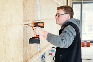 Obwohl die Architektur der EULE einzigartig und individuell wirkt, kommt auch hier der große Vorteil des Holzbaus zum Tragen: Der Großteil der verbauten Elemente wurde in der eigenen Werkstatt vorgefertigt und auf der Baustelle endmontiert. Eine im wahrsten Sinne des Wortes tragende Rolle haben dabei die Schrauben. Schließlich werden, bis die EULE bezugsfertig ist, zirka 250 000 Schrauben und Verbindungen bei der Innenwand- und Fassadenverkleidung gesetzt. Bei Rieg Holzbau arbeitet man dafür mit den neuesten Akku-Schraubern des in Schwäbisch Gmünd-Bargau ansässigen Unternehmens Fein. Die Mitarbeiter von Rieg schätzen an den neuen Akku-Bohrschraubern (die neue Modellreihe ist erst seit September 2013 auf dem Markt) ganz besonders ihren robusten Charakter und ihre Zuverlässigkeit: „Im Vergleich zu anderen Akku-Schraubern zeigen diese Schrauber die beste Leistung“, sagt Oliver Schubauer, Zimmermann bei Rieg. Mit einem Akku bekommt man richtig was weggeschafft – und geladen sind die Akkus auch zügig. Ein echter Pluspunkt, sagen die Handwerker, sei auch das Gewicht. „Wer sechs bis acht Stunden am Tag den Schrauber in der Hand hat, freut sich über jedes Gramm, das er nicht halten muss“, sagt Schubauer.