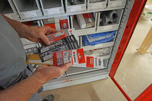 In den Schrankfächern finden sich Produkte, die häufig auf der Baustelle gebraucht werden, z. B. Bits oder Cuttermesserklingen