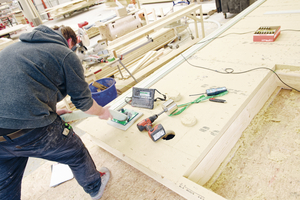 Im Werk von Terhalle Holzbau wurde eine Zelluloseeinblasdämmung in die Gefache der Holzrahmenbauelemente eingebracht
