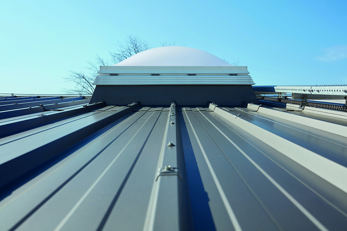 Neben zahlreichen Neuheiten präsentiert Kingspan Light + Air auch etablierte Systeme, darunter ein „Built-In“-Element mit vormontierter Lichtkuppel in Sandwichdachpaneelen