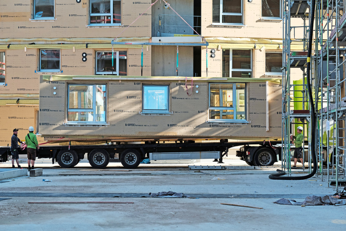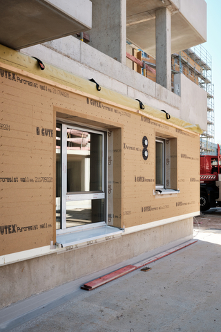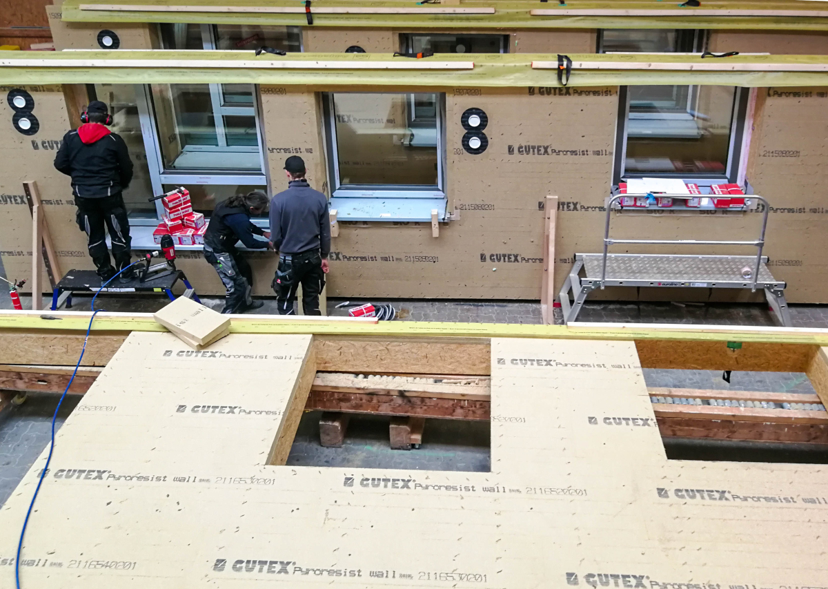 Im Rahmen der Vorfertigung wurden schwer entflammbare Holzfaserdämmplatten von Gutex verarbeitet