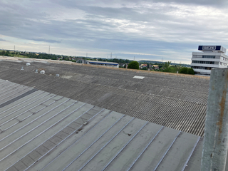 Im ersten Schritt wurde die vorhandene, asbesthaltige Wellplatten-Eindeckung der Produktionshallen unter Einhaltung sämtlicher Arbeitsschutzvorgaben bis auf die Porenbeton-Platten zurückgebaut. „Da der Rückbau im laufenden Betrieb erfolgte, mussten wir alles mit Schutznetzen und aufliegendem Staubschutzvlies auskleiden, um zu verhindern, dass Staub und Schmutz in die darunter befindlichen Räume gelangen“, sagt Stefan Vurusic. Die anschließend verlegte einlagige Bitumendampfsperre diente gleichzeitig als Notabdichtung für das Dach.