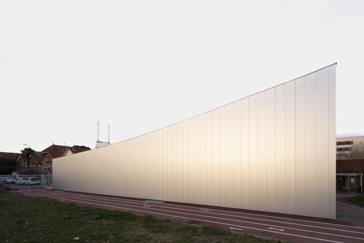 Die silbrig-matte Aluminiumfassade des Sportzentrums im französischen Choisy-le-Roi ist nicht nur für Sportbegeisterte ein echter Hingucker
