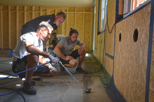 Die Mitarbeiter von Holzbau Moser schätzen besonders die rückenschonende Arbeitsweise – das Abdichten lässt sich jetzt im Stehen erledigen, wo früher stundenlang auf den Knien gearbeitet werden musste. „Die anfängliche Skepsis gegenüber dem Airlessgerät ist gewichen“, so Kevin Reinhold. „Die Maschine lässt sich einfach bedienen und die vergleichsweise kurzen Rüstzeiten können wir gut in den normalen Baustellenablauf integrieren.“ Künftig sollen zwei bis drei Mitarbeiter für die Arbeit mit der Sprühdichtung ausgebildet werden. „Sockelanschlüsse sind aber nur der Anfang: Ich kann mir gut vorstellen, künftig auch bei anderen Anschlussbereichen wie bei Hybridbauten oder in der Sanierung – also immer, wenn unterschiedliche Bauweisen und Materialien aufeinandertreffen – mit der Sprühfolie zu arbeiten“, sagt Kevin Reinhold.