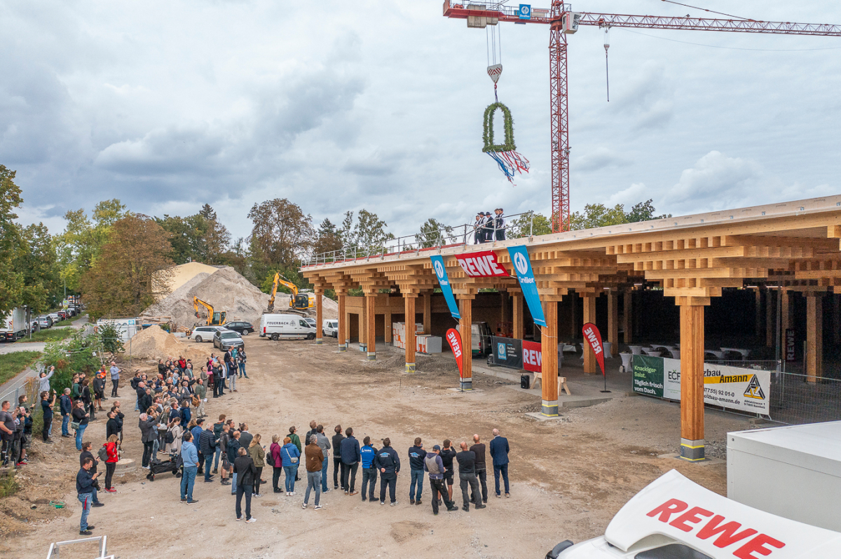 Das neue „Green Building” von Rewe in Berlin feierte sechs Monate nach Beginn der Bauzeit Richtfest. Bis dahin wurden rund 1450 m3 Nadelholz verbaut