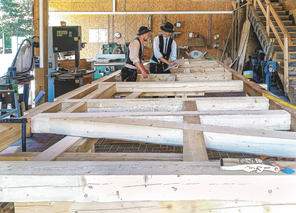 Die Zimmerer Leon Kasper (links) und Franz-Georg Neuner in der ersten, fertiggestellten Wand für das Fachwerkhaus