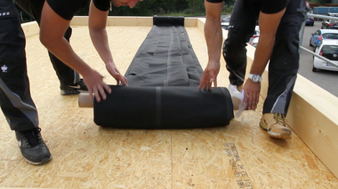Für die Abdichtung der Balkone empfahl Dachdecker und Zimmerer Björn Tölle dem Bauherrn EPDM. Dieser Werkstoff ist aufgrund seiner molekularen Netzstruktur besonders witterungs- und somit alterungsbeständig. Das Süddeutsche Kunststoff-Zentrum bescheinigt EPDM eine Gebrauchsdauer von über 50 Jahren. Björn Tölle plante zunächst, „Resitrix“-EPDM-Bahnen von Carlisle CM Europe einzusetzen. Mit diesem Material hatte er gute Erfahrungen gemacht und setzt es bereits seit zwei Jahren bei seinen Abdichtungsprojekten ein. Einen besonders wichtigen Vorteil für den Holzbau sieht der Handwerker darin, dass die Nahtfügung einfach per Heißluftverschweißung erfolgt, ohne offene Flamme und somit ohne Brandgefahr.