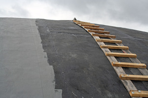 Das erste Kuppeldach dichteten die Dachdecker im Herbst ab. Die Arbeiten am zweiten Dach zogen sich aber über den Winter bis ins Frühjahr. „Da oben war es extrem windig und kalt, zum Teil bis zu Windstärke 7“, sagt Dachdeckermeister Wilhelm Kuhlkamp, „an manchen Tagen konnte gar nicht gearbeitet werden.“ Um das Projekt dennoch zügig abzuschließen, veranlasste Triflex die Sonderproduktion der Abdichtung „Triflex ProDetail“ im Großgebinde. Das vereinfachte die Belieferung und reduzierte die Anfahrten zur Baustelle.