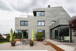 Die grünen Schieferwerksteine prägen Dach und Fassade des Wohnhauses, das unweit von Frankfurt a.M. steht. Die Oberfläche des grünen Schiefers korrespondiert mit den anderen Materialien, die am Wohnhaus verbaut sind: Der lang gestreckte Eingangsbereich sowie die Garagen, eine Gaube und Unterdecken sind mit „Alucobond“-Aluminiumverbundplatten bekleidet. Das Erdgeschoss und Obergeschoss wurden in Massivbauweise mit Kalksandsteinen und Beton erstellt. Das Dachgeschoss an der Straßenseite erstellte die Zimmerei- und Bedachungs-GmbH Kai Laumann in Holzrahmenbauweise.