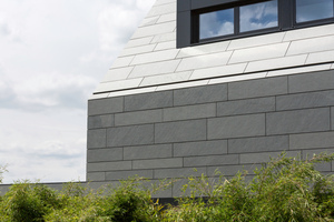 Dann wurden die Schiefersteine auf der Unterkonstruktion montiert. Verlegt wurden sie im wilden Verband mit umlaufenden, 10 mm breiten Fugen. In jeden Schieferstein schraubten die Handwerker auf der Rückseite mindestens 4 Agraffen. Mit den Agraffen hängten sie die Schiefersteine in die Tragprofile der Unterkonstruktion ein und richteten sie aus. Durch eine Schraube in eine der oberen Agraffen sicherten sie die Schiefersteine zusätzlich. Bei der Montage mussten die Dachdecker besonders genau arbeiten. „Jeder Schieferstein wurde zu zweit getragen und montiert, um Beschädigungen zu vermeiden“, sagt Udo Schneider. Hinter den Schiefersteinen wurden die Fenster und Türen eingebaut. Für einen besseren Sonnenschutz wurden einige exponierte Fenster mit Raffstores ausgestattet.