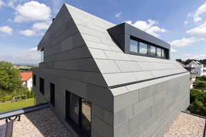 Regenwasser fließt durch die offenen Fugen zwischen den Schiefersteinen auf das wasserführende, anthrazitfarbene Unterdach und wird in einer unsichtbar unter der Dachhaut installierten Kastenrinne abgeführt. Die Kastenrinne liegt am Übergangsbereich zwischen Dach und Wand und ist von außen nur durch einen schmalen, durchgängigen Schlitz erkennbar. „Insgesamt lief das Projekt gut und die Zusammenarbeit mit Hersteller, Architekt und Bauherr war sehr angenehm“, sagt Dachdeckermeister Udo Schneider, „wir freuen uns schon darauf, wenn wir wieder eine Fassaden- und Dachbekleidung mit Schiefersteinen durchführen können!“