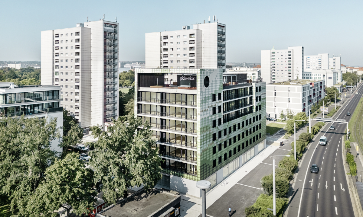 Am viel befahrenen Straßburger Platz in Dresden wurde nach dem umstrittenen Abriss einer ehemaligen „DDR-Kantine“ mit einem Neubau weiterer Wohnraum geschaffen. Die Fassade aus grünen und weißen...