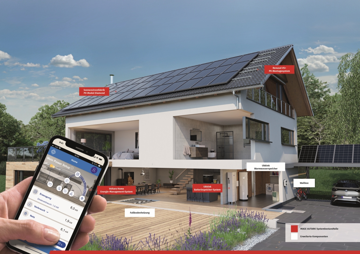 Der Solarstrom für „Mage Autark“-Projekte wird durch PV-Module mit 30 Jahren Leistungsgarantie erzeugt, gefertigt werden die Solarmodule in Deutschland durch die Sonnenstromfabrik. Ein Batteriespeicher-System von Ubbink fungiert im Rahmen des „Mage Autark“-Konzepts als Stromspeicher und Hybrid-Wechselrichter in einem. Es verteilt die PV-Energie nach Bedarf an Haushaltsgeräte oder das öffentliche Netz. Überschüsse lagert es in stapelbaren LFP-Batteriemodulen mit 5,12 bis 25,6 kWh Gesamtfassungsvermögen. Im Voltara Home Energie-Management-System mit Mobil-App lässt sich der Anlagenbetrieb überwachen sowie priorisieren, wie die gewonnene Solarenergie genutzt wird – zum Beispiel für E-Auto, Wärmepumpenbetrieb oder Batterieaufladung.