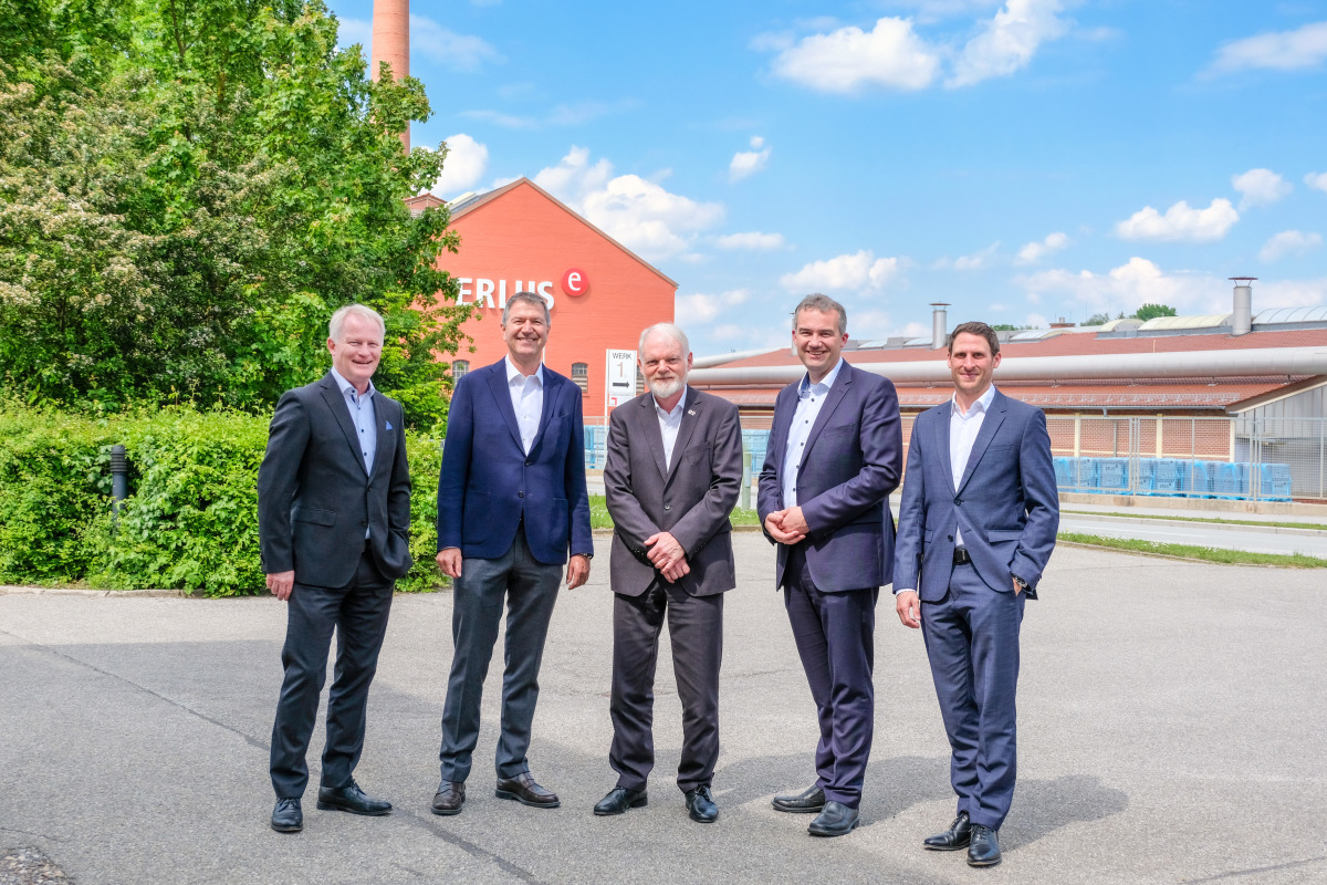 Peter Hoffmann (Mitte), langjähriger Vorsitzender der Erlus AG, übergibt die Unternehmensleitung Ende Juni 2023 an seine Nachfolger: Rüdiger Grau (links, bisher Technikvorstand), Marketing- und Vertriebsvorstand Patrick Dietrich (rechts) und Martin Eisenreich (2. von rechts), der Vorstand für den kaufmännischen Bereich wird. Claus Girnghuber (2. von links) bleibt Aufsichtsratsvorsitzender der Erlus AG