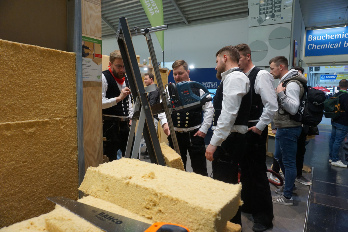 Die Laufzeit der Messe BAU wird ab 2025 von sechs auf fünf Tage verkürzt. Am Steico-Messestand auf der BAU 2023 in München informierten sich Zimmerer über Holzfaserdämmstoffe