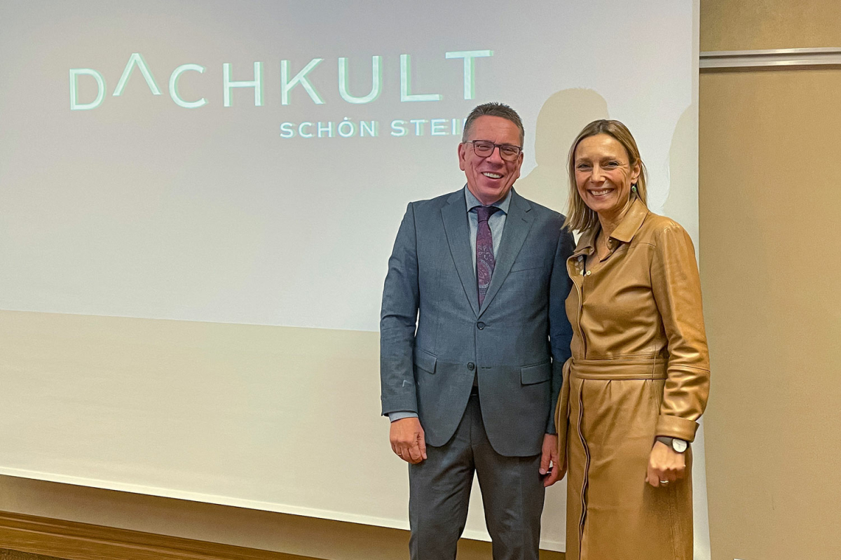 Fleck-Geschäftsführer Christoph Nielacny (links) mit Petra Schumacher (rechts), Sprecherin der Initiative Steildach/"Dachkult", bei der Neugründung des Vereins