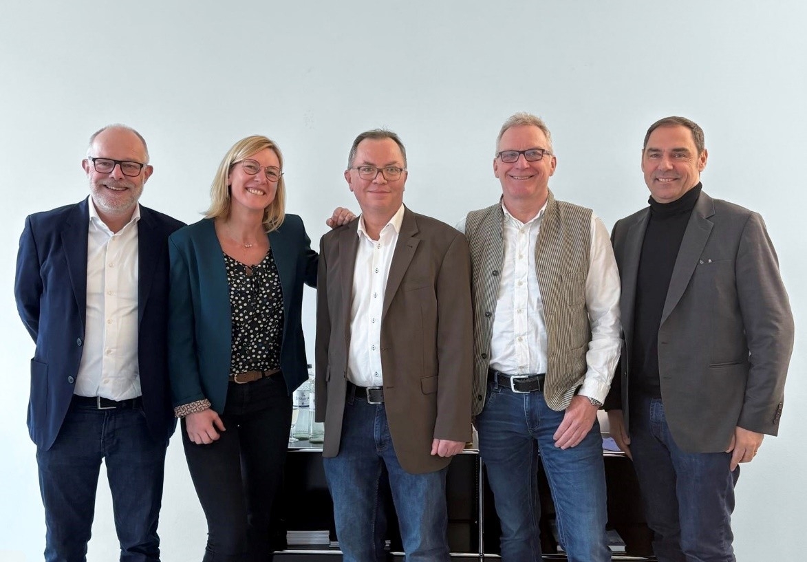 (von links nach rechts:) Michael Binné (bisheriger Binné-Geschäftsführer), Kristina Milosch (Unternehmenssprecherin von Soprema), Thilo Binné (Standortleiter und Prokurist des Binné-Werks in Pinneberg), Winfried Traub (Geschäftsführer von Soprema, Binné und Kluth Dachbaustoffe), Christophe Feist (General Manager Zentral- und Osteuropa, Soprema-Gruppe)